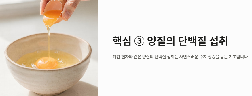 - 계란 흰자와 같은 양질의 단백질 섭취는 자연스러운 수치 상승을 돕는 기초입니다.