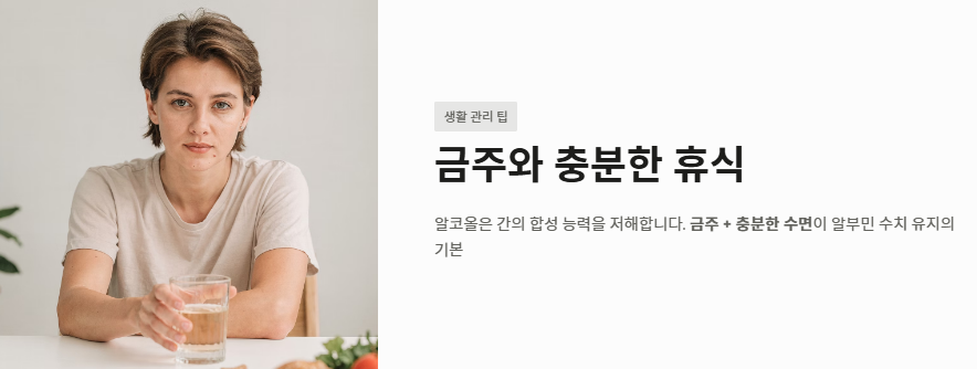 - 금주와 충분한 휴식: 간의 합성 능력을 저해하는 알코올을 멀리해야 알부민의 효능을 유지할 수 있습니다.