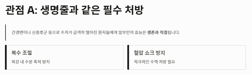 - 관점 A: "심각한 결핍 환자에게는 생명줄과 같은 필수 처방이다" 간경변이나 신증후군 등으로 수치가 급격히 떨어진 환자들에게 알부민의 효능은 생존과 직결됩니다. 복수를 조절하고 혈압 쇼크를 방지하기 위해 적극적인 수액 처방을 통해 알부민의 효능을 끌어올려야 한다는 입장입니다.