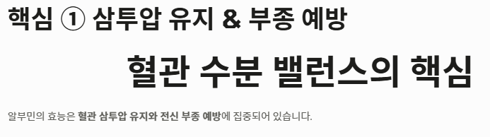 - 알부민의 효능은 혈관 삼투압 유지와 전신 부종 예방에 집중되어 있습니다.