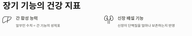 - 4단계: 장기 기능의 건강 지표: 체내 알부민 수치는 간의 합성 능력과 신장의 배설 기능을 나타내는 중요한 성적표입니다. 정상 수치를 유지함으로써 장기 건강을 보호하는 것이 궁극적인 알부민의 효능이라 할 수 있습니다.
