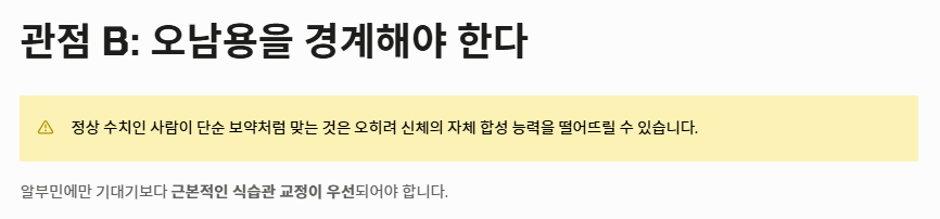 - 관점 B: "일반인의 단순 피로 회복용 오남용을 경계해야 한다" 반면 정상 수치인 사람이 단순 보약처럼 맞는 것은 알부민의 효능을 제대로 얻지 못할뿐더러 오히려 신체의 자체 합성 능력을 떨어뜨릴 수 있다는 시각입니다. 알부민의 효능에만 기대기보다 근본적인 식습관 교정이 우선되어야 한다는 주장입니다.