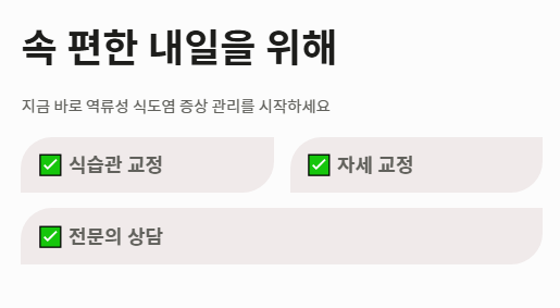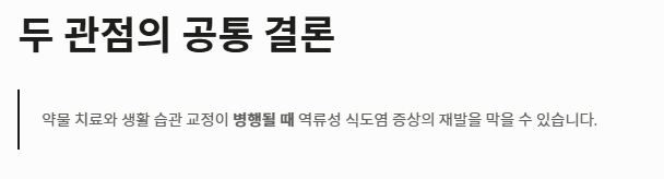 - 약물 치료와 생활 습관 교정이 병행될 때 역류성 식도염 증상의 재발을 막을 수 있습니다.