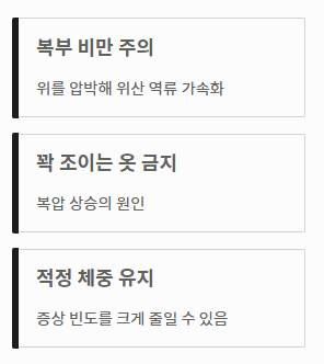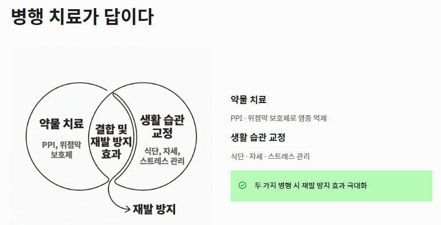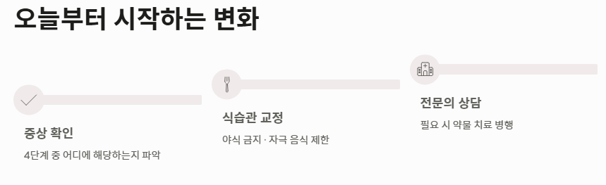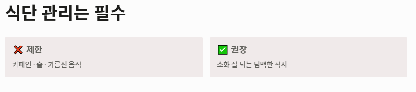 - 자극적인 음식(카페인, 술, 기름진 음식)을 제한하는 식단 관리가 필수입니다.