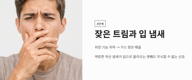 - 4단계: 잦은 트림과 입 냄새: 위장 기능이 저하되어 가스가 자주 배출되고, 역류한 위산 냄새가 입을 통해 올라오기도 합니다. 구취 역시 무시할 수 없는 역류성 식도염 증상 중 하나입니다.