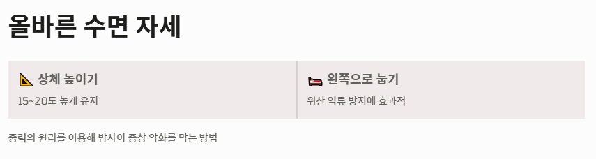 - 왼쪽으로 누워 자거나 상체를 높이는 자세가 예방에 효과적입니다.