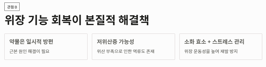 - 관점 B: "위장 기능 회복과 식단 관리가 본질적인 해결책이다" 반면 생활 의학 및 기능 의학 전문가들은 약물은 일시적인 방편일 뿐이라고 지적합니다. 위산이 부족해서 생기는 역류(저위산증)의 가능성도 열어두고, 소화 효소 보충과 스트레스 관리를 통해 위장 운동성을 높여야 역류성 식도염 증상의 재발을 막을 수 있다고 주장합니다.