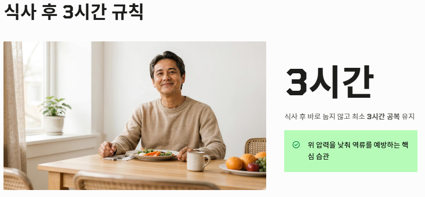 - 식후 즉시 눕는 습관과 야식은 역류성 식도염 증상을 악화시키는 가장 큰 요인입니다.