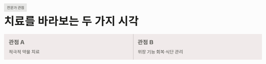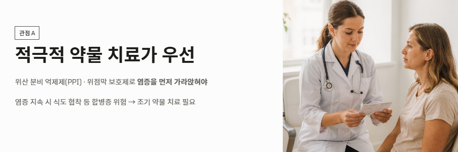 - 관점 A: "적극적인 약물 치료를 통한 점막 보호가 우선이다" 전문의들은 위산 분비 억제제(PPI)나 위점막 보호제를 통해 일차적으로 염증을 가라앉히는 것이 중요하다고 강조합니다. 염증이 지속되면 식도 협착 등 합병증이 생길 수 있으므로, 역류성 식도염 증상이 나타날 때 조기에 약물 도움을 받아야 한다는 입장입니다.