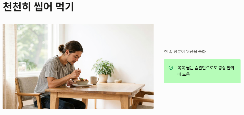 - 천천히 씹어 먹기: 침 속의 성분은 위산을 중화시켜 역류성 식도염 증상 완화를 돕습니다.