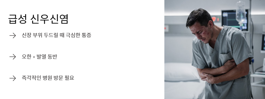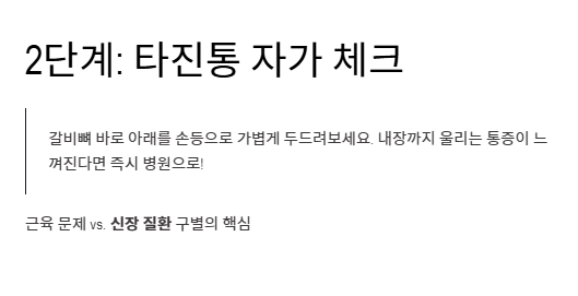 - 두드렸을 때의 통증(타진통)이나 고열, 소변 이상이 있다면 즉시 응급 처치가 필요합니다.