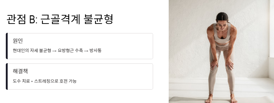 - 관점 B: "생활 습관에 기인한 근골격계 불균형에 주목해야 한다" 현대인의 고질적인 자세 불균형이 특정 근육(요방형근 등)을 수축시켜 내부 장기 통증과 유사한 방사통을 일으킵니다. 이 시각에서는 불필요한 공포를 갖기보다 척추와 근육의 긴장을 오른쪽 옆구리 뒤쪽 통증 의심되는병의 주범으로 보고 도수 치료나 스트레칭을 강조합니다.