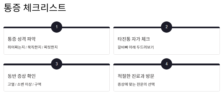통증이 발생했을 때 당황하지 않고 오른쪽 옆구리 뒤쪽 통증 의심되는병을 가려내는 단계별 가이드입니다.
