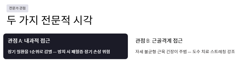 전문가들 사이에서도 통증의 근본 원인을 접근하는 방식에 있어 두 가지 주요 시각이 존재합니다.