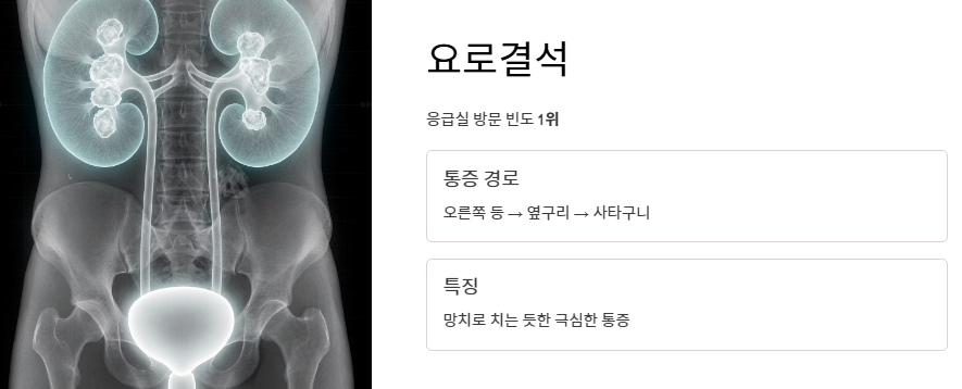 - 망치로 치는 듯한 날카로운 통증: 요로결석 오른쪽 등 뒤쪽에서 시작해 옆구리, 심지어 사타구니까지 뻗치는 극심한 통증은 요로결석의 전형적인 증상입니다. 이는 오른쪽 옆구리 뒤쪽 통증 의심되는병 중 응급실 방문 빈도가 가장 높은 질환입니다.