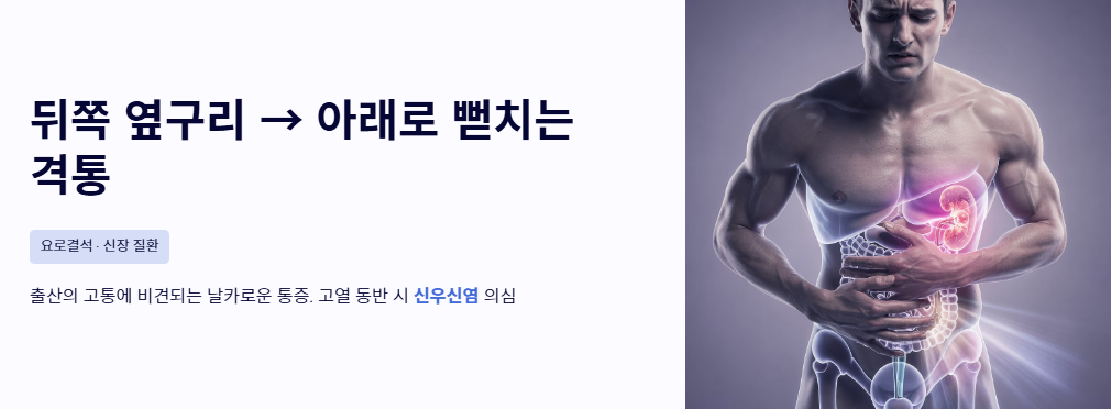 - 뒤쪽 옆구리에서 등으로 뻗치는 격한 통증 (요로결석 및 신장 질환): 출산의 고통에 비견될 만큼 날카로운 통증이 옆구리 뒤쪽에서 시작되어 아래쪽으로 뻗친다면 요로결석을 의심해야 합니다. 신우신염처럼 신장에 염증이 생겼을 때도 고열과 함께 오른쪽 옆구리 통증 의심되는병이 나타납니다.