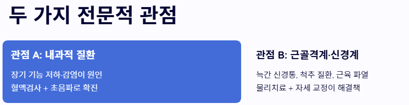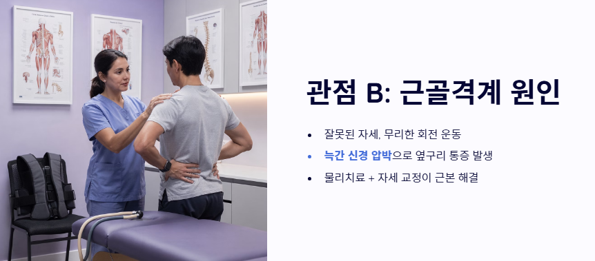 - 관점 B: '근골격계 및 신경계 문제'의 관점 내부 장기에 이상이 없다면 늑간 신경통이나 척추 질환, 혹은 근육의 미세 파열을 원인으로 봅니다. 잘못된 자세나 무리한 회전 운동이 신경을 압박하여 나타나는 오른쪽 옆구리 통증 의심되는병일 수 있으므로 물리치료와 자세 교정이 근본 해결책이라는 관점입니다.