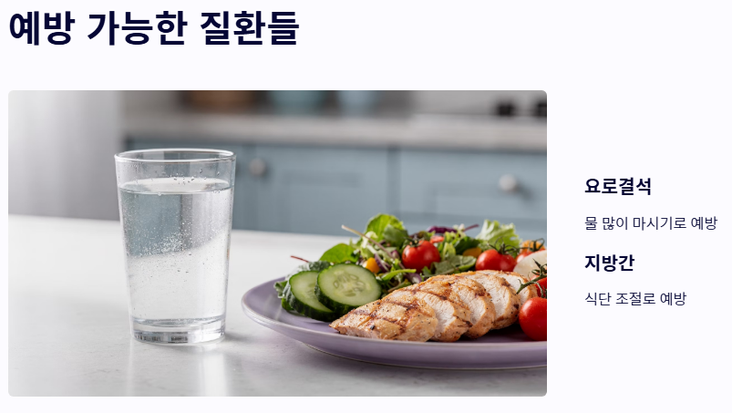 - 요로결석은 물을 많이 마시는 습관으로, 지방간은 식단 조절로 예방할 수 있습니다.