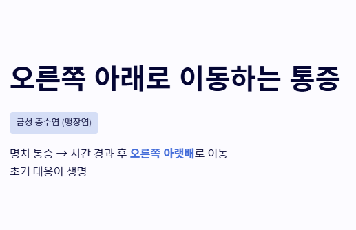 - 오른쪽 아래쪽으로 이동하는 통증 (맹장염/충수염): 처음에는 명치 부근이 체한 듯 아프다가 시간이 지나면서 오른쪽 아래 옆구리로 통증이 내려온다면 급성 충수염일 확률이 매우 높습니다. 초기 대응이 중요한 대표적인 오른쪽 옆구리 통증 의심되는병입니다.