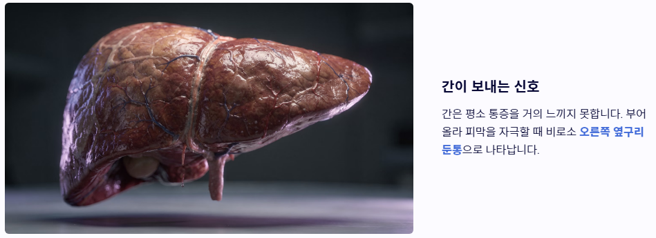- 상복부와 옆구리가 둔탁하게 아픈 경우 (간 및 담낭 질환): 간 수치가 높거나 지방간, 간염이 심해지면 간이 부어올라 피막을 자극하게 됩니다. 또한 담석증이나 담낭염이 생기면 식후에 오른쪽 옆구리와 등까지 뻗치는 통증이 나타날 수 있습니다. 이는 침묵의 장기가 보내는 오른쪽 옆구리 통증 의심되는병의 전형적인 신호입니다.