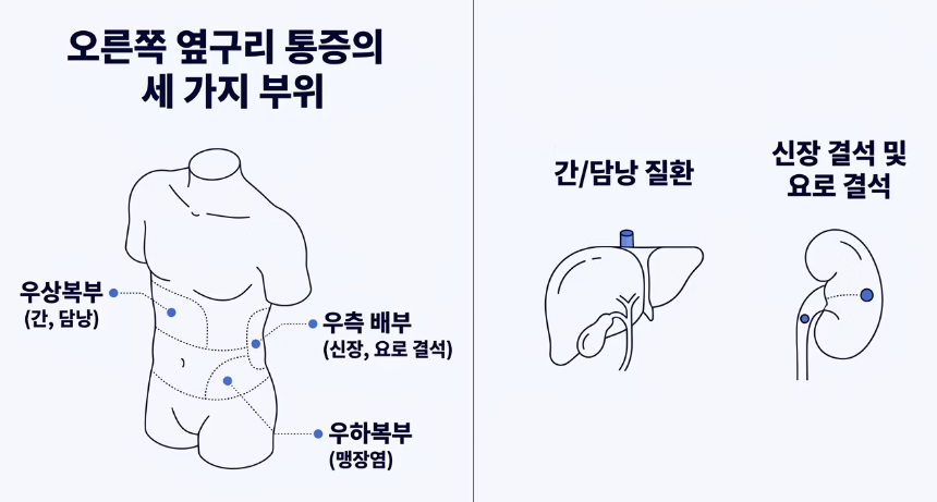 오른쪽 옆구리 통증 의심되는병 : "단순히 담이 걸린 걸까요, 아니면 내 몸속 장기가 보내는 긴급 구조 신호일까요? 예고 없이 찾아온 오른쪽 옆구리의 찌릿한 통증, 가볍게 넘겨서는 안 되는 이유가 있습니다."