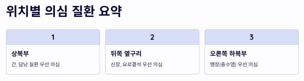 - 상복부 통증은 간과 담낭, 뒤쪽은 신장, 하복부는 맹장을 가장 먼저 의심해야 합니다.