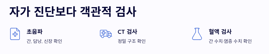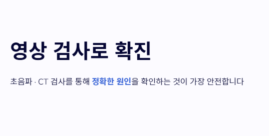 - 자가 진단보다는 초음파나 CT 등 객관적인 검사를 통해 확진받는 것이 안전합니다.