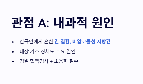 - 관점 A: '내과적 질환 및 장기 염증'의 관점 옆구리 통증은 내부 장기의 기능 저하나 감염에서 비롯된다고 봅니다. 특히 한국인에게 흔한 간 질환이나 비알코올성 지방간, 대장 가스 정체 등을 주요 원인으로 꼽으며, 정밀 혈액 검사와 초음파를 통해 오른쪽 옆구리 통증 의심되는병의 뿌리를 찾아야 한다는 시각입니다.