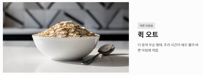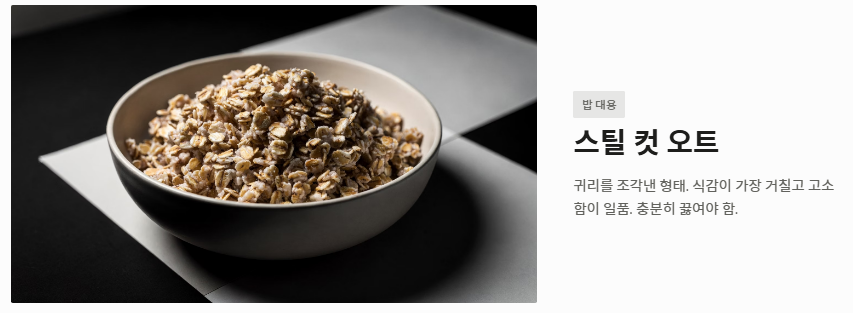 - 롤드 오트 (Rolled Oats): 귀리를 쪄서 압착한 것으로 식감이 적당히 살아있어 오버나이트 오트밀이나 죽 요리에 가장 범용적으로 쓰입니다.