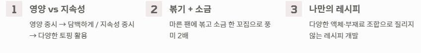 - 영양을 중시한다면 담백하게, 지속성을 중시한다면 다양한 토핑을 활용합니다.