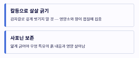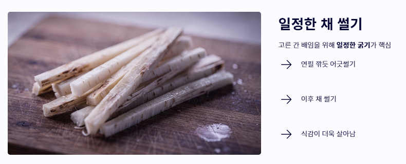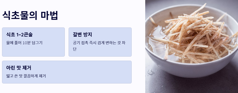 - 식초물에 담가 갈변과 아린 맛을 제거하는 전처리가 필수입니다.