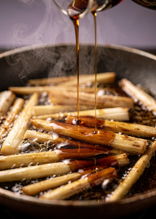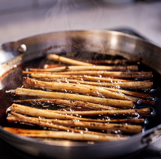 이제 준비된 우엉에 깊은 색과 윤기를 입히는 본격적인 조리 단계입니다.