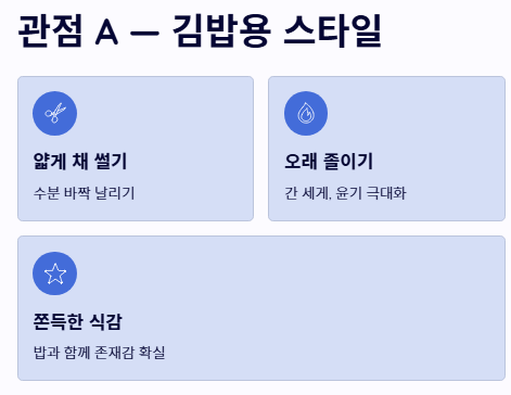- 관점 A: '쫀득하고 진한' 김밥용 스타일 우엉을 얇게 채 썰고 오랜 시간 졸여 수분을 바짝 날립니다. 간을 조금 더 세게 하고 윤기를 극대화하여 밥과 함께 먹었을 때 존재감이 확실한 우엉조림 맛있게 하는법을 선호하는 분들에게 적합합니다.