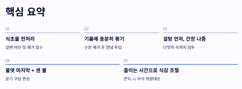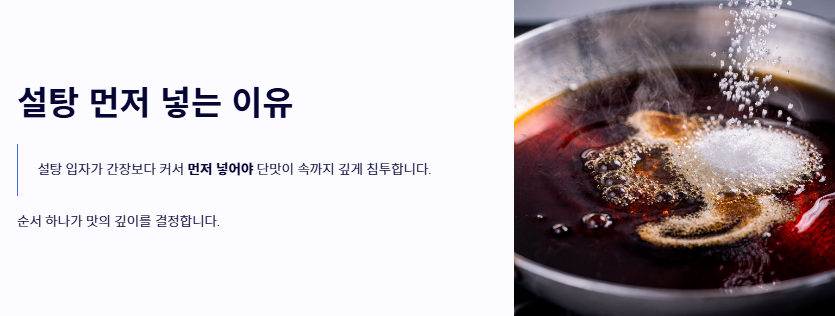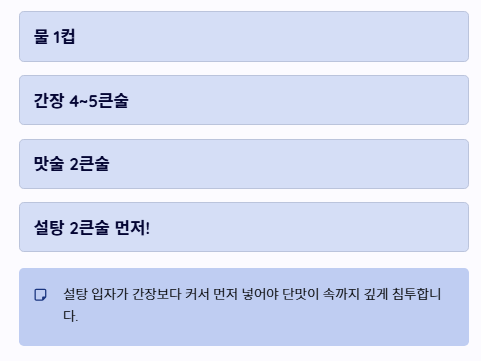 - 설탕을 먼저 넣어 단맛을 입히고, 나중에 간장을 조절하는 순서를 지킵니다.