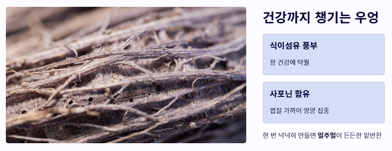 - 다시마 육수의 활용: 맹물 대신 다시마 우린 물을 사용해 보세요. 조미료 없이도 깊은 감칠맛이 나는 우엉조림 맛있게 하는법이 완성됩니다.