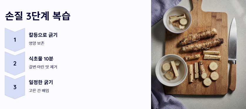맛있는 조림의 시작은 원재료인 우엉을 얼마나 깔끔하고 부드럽게 다루느냐에 달려 있습니다. 우엉조림 맛있게 하는법에서 가장 중요한 첫 번째 단계는 갈변과 떫은맛을 잡는 것입니다.