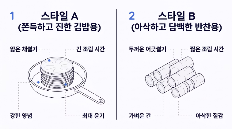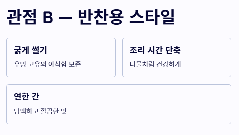 - 관점 B: '아삭하고 담백한' 반찬용 스타일 우엉을 조금 더 굵게 썰고 조리 시간을 단축하여 우엉 고유의 아삭한 씹는 맛을 살립니다. 간을 연하게 하여 나물처럼 건강하게 즐기는 우엉조림 맛있게 하는법을 지향하는 관점입니다.