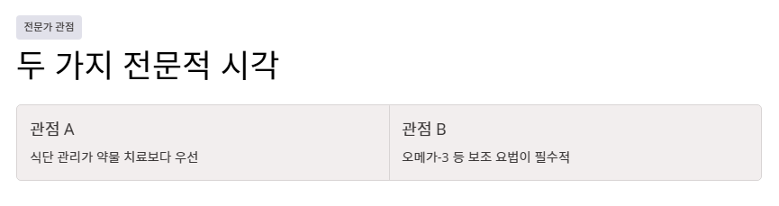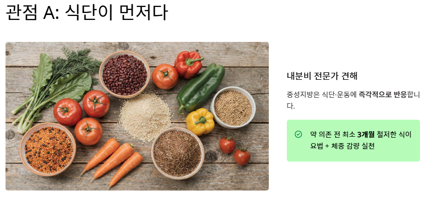 - 관점 A: "식단 관리가 약물 치료보다 우선이다" 많은 내분비 전문가들은 중성지방의 경우 생활 습관 교정 효과가 매우 드라마틱하다고 봅니다. 콜레스테롤과 달리 중성지방은 식단과 운동에 즉각적으로 반응하기 때문에, 약에 의존하기 전 최소 3개월간 철저한 식이요법과 체중 감량을 실천하는 것이 근본적인 중성지방 낮추는 방법이라고 강조합니다.