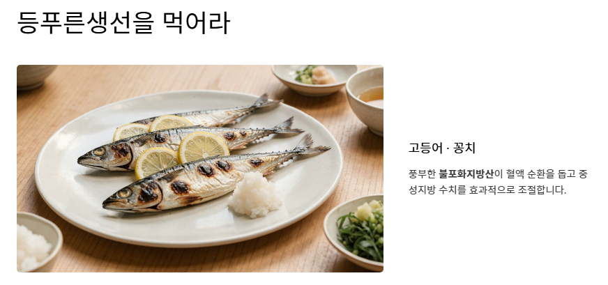- 등푸른생선 섭취: 고등어, 꽁치 등에 풍부한 불포화지방산은 혈액 순환을 돕고 중성지방 수치를 조절하는 데 효과적입니다.