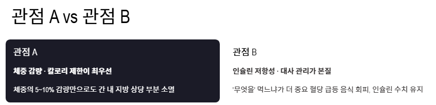 • 관점 B: "인슐린 저항성과 대사 질환 관리가 본질이다" 단순히 적게 먹는 것보다 '무엇을' 먹느냐가 중요하다는 주장입니다. 혈당을 급격히 올리는 음식을 피하고 인슐린 수치를 낮게 유지하는 것이 체중 수치보다 더 중요한 지방간 없애는 방법이라고 강조합니다.