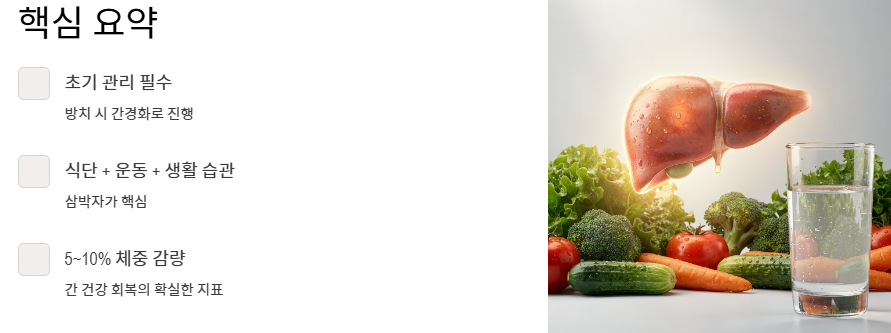 오늘 상세히 살펴본 지방간 없애는 방법에 대한 핵심 내용을 정리합니다.