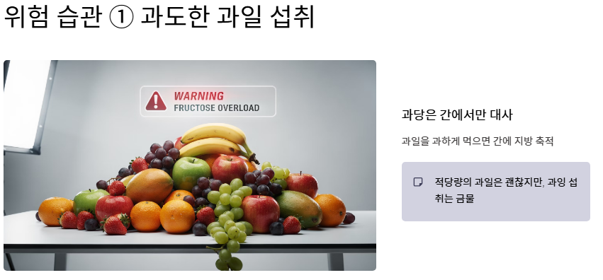 • 과도한 과일 섭취: 과일의 과당은 간에서만 대사되므로 과하게 먹으면 간에 지방이 쌓입니다.