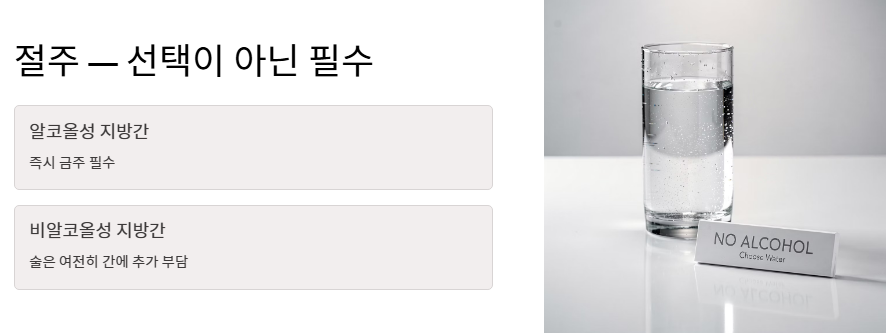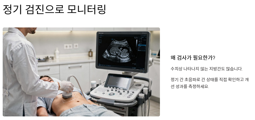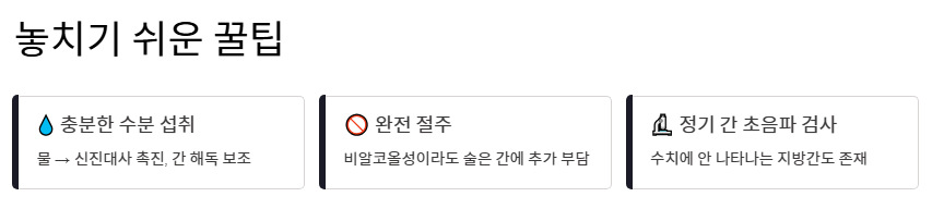 • 지방간은 방치하면 간경화로 이어지는 무서운 질환이므로 초기 관리가 필수입니다.