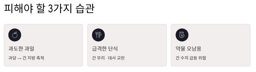• 급격한 단식: 너무 굶으면 오히려 간에 무리가 가고 지방 대사가 꼬일 수 있습니다. 단계적인 지방간 없애는 방법이 필요한 이유입니다.