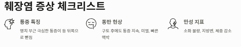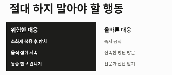 - 동반 현상: 구토를 해도 통증이 지속되고 미열이나 빠른 맥박이 나타난다면 빠른 대처가 필요합니다.