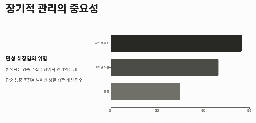 만성적으로 반복되는 췌장염 증상은 결국 장기적인 관리의 문제입니다. 술과 고지방 식단이 췌장을 계속 자극하기 때문에, 단순한 통증 조절을 넘어 철저한 금주와 저지방 식단을 유지해야만 췌장염 증상의 재발을 막고 췌장암으로의 진행을 예방할 수 있다고 조언합니다.