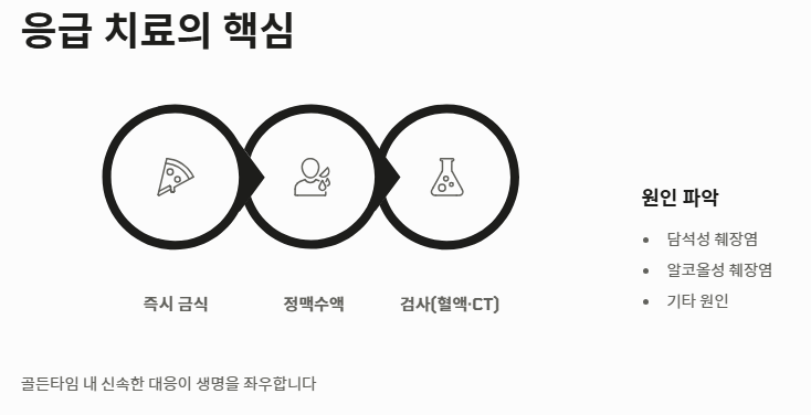 - 주의 사항: 췌장염 증상이 의심될 때는 절대 음식을 섭취하지 말고 병원을 방문해야 합니다.