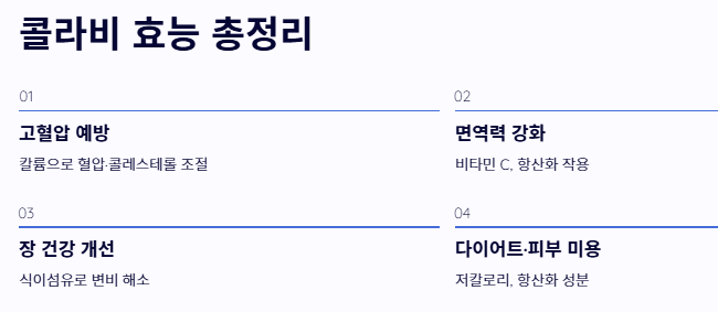 - 콜라비 효능의 정수는 고혈압 예방, 면역력 강화, 장 건강 개선에 있습니다.