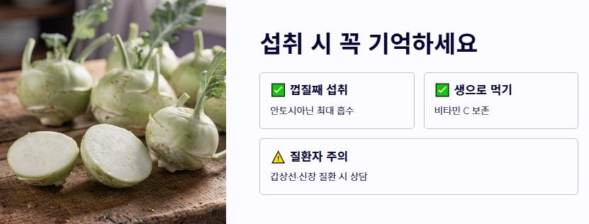 단순히 깎아 먹는 것을 넘어, 영양소 파괴를 줄이고 콜라비 효능을 100% 흡수하기 위한 단계별 섭취법을 제안합니다.