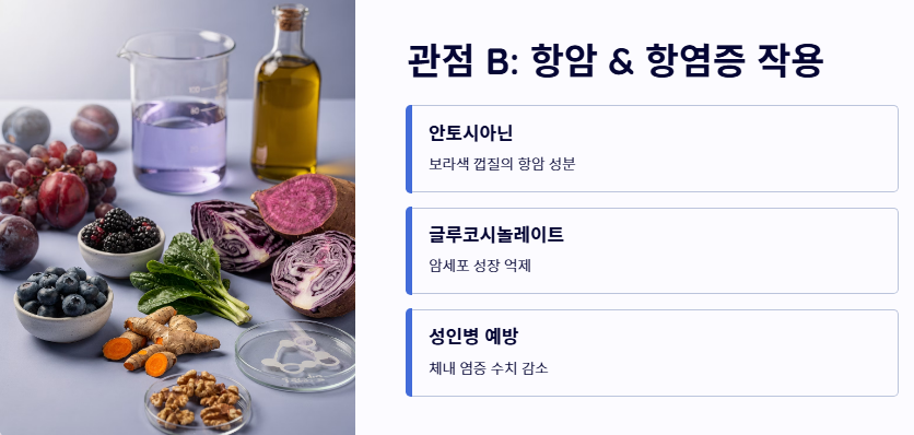 - 관점 B: '항암 및 항염증 작용'의 강조 콜라비의 보라색 껍질에 든 안토시아닌과 글루코시놀레이트 성분의 항암 효과에 주목합니다. 체내 염증 수치를 낮추고 암세포의 성장을 억제하는 예방 의학적 측면에서의 콜라비 효능을 강조하며 성인병 위험군에게 적극 권장하는 입장입니다.